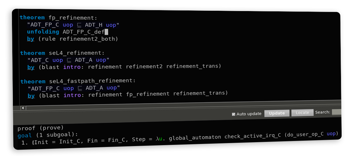 - within tools that can be used for formal machine-checked proof, the seL4 proofs use the proof assistant Isabelle/HOL, which is engineered to minimise the code that needs to trusted for the proof to be correct — see more on the assumptions page.